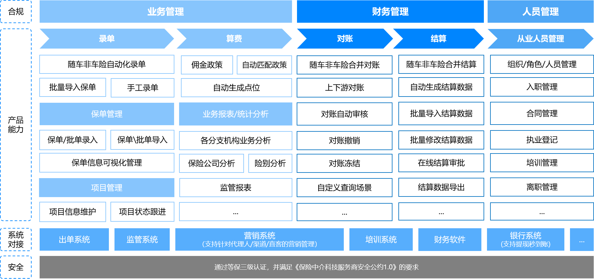 同时具备项目管理、保单管理、政策管理、产品管理、财务管理等多功能模块,助力企业合规化、专业化的高质量发展。
