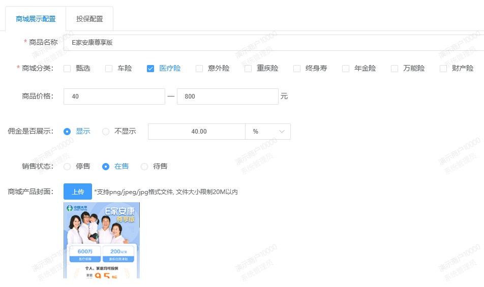 保险商城展示配置,例如商品名称、商城分类、商品价格、商品封面、销售状态等配置