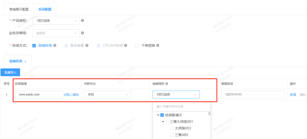 支持多种投保方式,例如链接投保、个单团做、CPS/API投保,同时对不同渠道可投保的方式或链接差异化授权