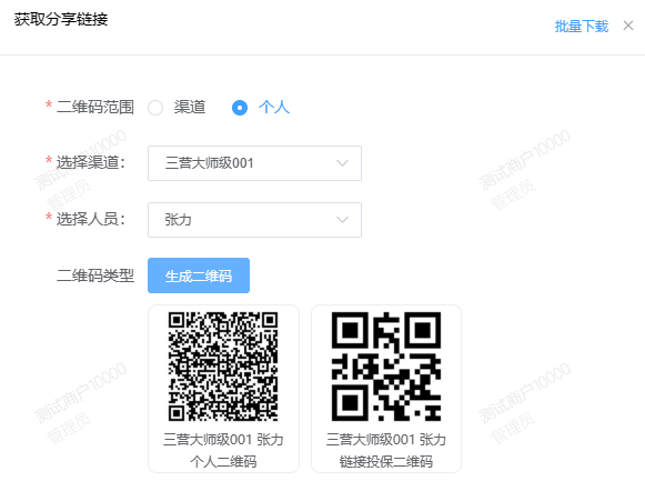 获取渠道或个人的产品分享投保二维码,支持单个或批量获取,为渠道或个人推广提供有力支撑,为渠道实现目标助力