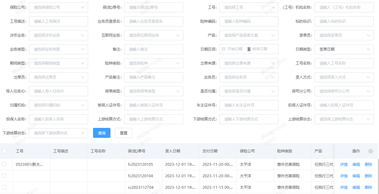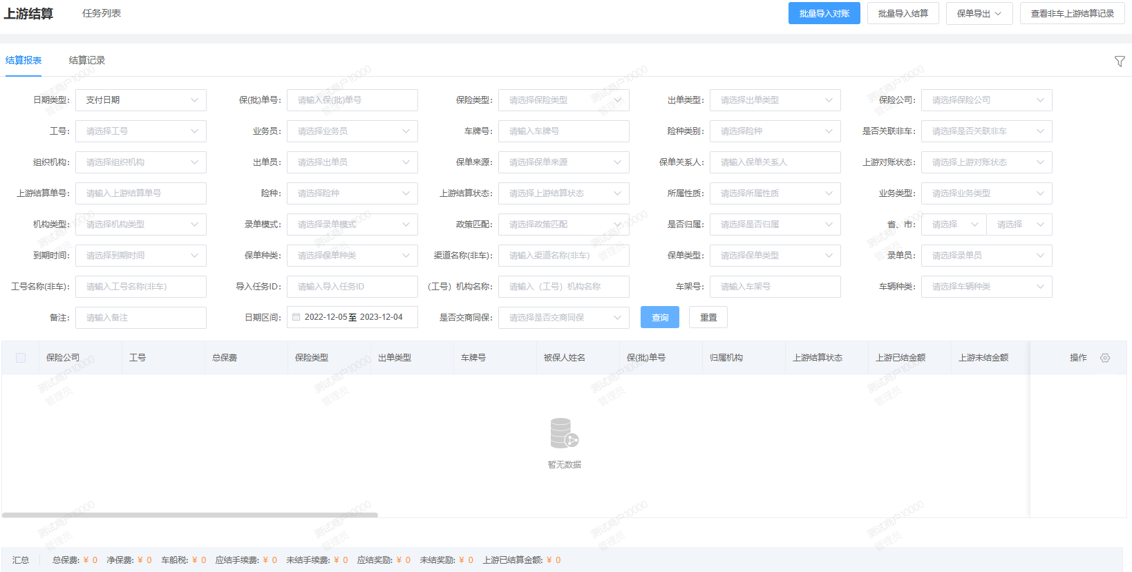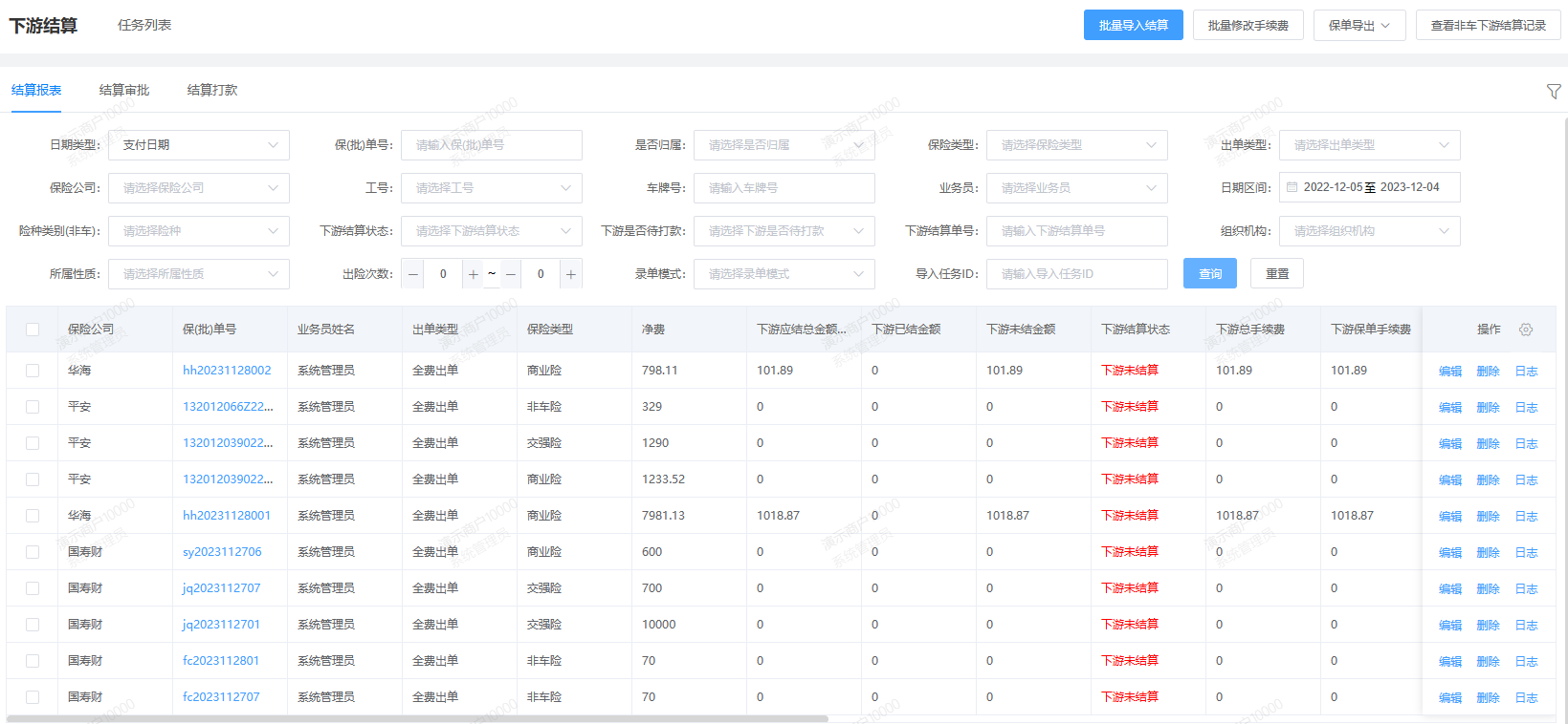 能自动生成结算明细,结算明细支持批量导出、撤销、删除,(删除后可重新生成)、关联保单等