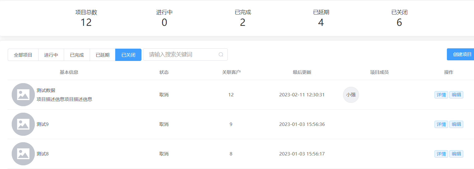 项目信息完整记录,包含项目基本信息及状态、参与人员、负责人员、相关附件等可根据项目进度随时调整项目状态
